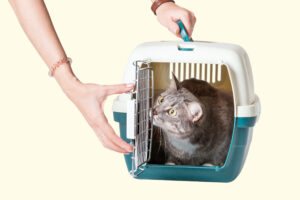 Hand carrying cat in a cage in veterinary clinic isolated on colored background