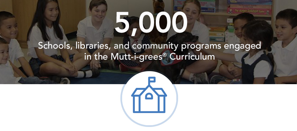 Approximately 5,000 schools, libraries, after-school programs, homes, and communities are now helping build resilience and compassion in the next generation. The Curriculum’s goals include promoting awareness of the desirability of shelter animals, referred to as Mutt-i-grees, and enhancing children’s resilience and social emotional competence.
