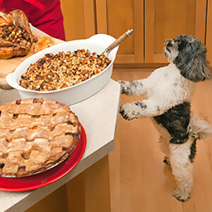 Pet Dog Begging for Thanksgiving Turkey from Woman in Kitchen