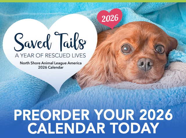 Our full-size 2026 calendar celebrating Saved Tails will be available this fall. Saved Tails celebrates a year of incredible rescued dogs, cats, puppies and kittens who found nurturing, love and a new beginning thanks to North Shore Animal League America’s no-kill mission. Let these inspiring faces remind you every day of the lives saved — and the countless more waiting for their chance.