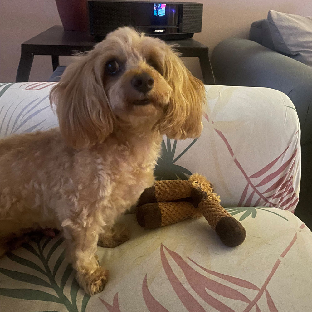 Little Man really enjoys having his mom Peggy working from home due to the COVID-19 pandemic. He sleeps late, plays hard on their lunchtime walk, and then takes a long afternoon nap. He has a doggie friend named Sampson who they often meet outside. Little Man’s a very social guy! Little Man’s new “hobby” is practicing yoga with Peggy. He sits on her to make sure she stays in the pose! Little Man has also become a big FaceTime fan. If a friend or family member calls and he recognizes the voice, he will run from the other room to sit with her while she chats. He’s really been the best company his mom could ask for, especially while working from home. He’s amazing and Peggy loves him very much.