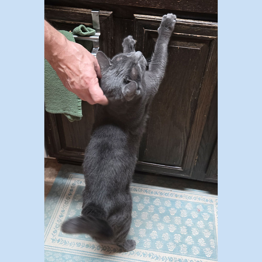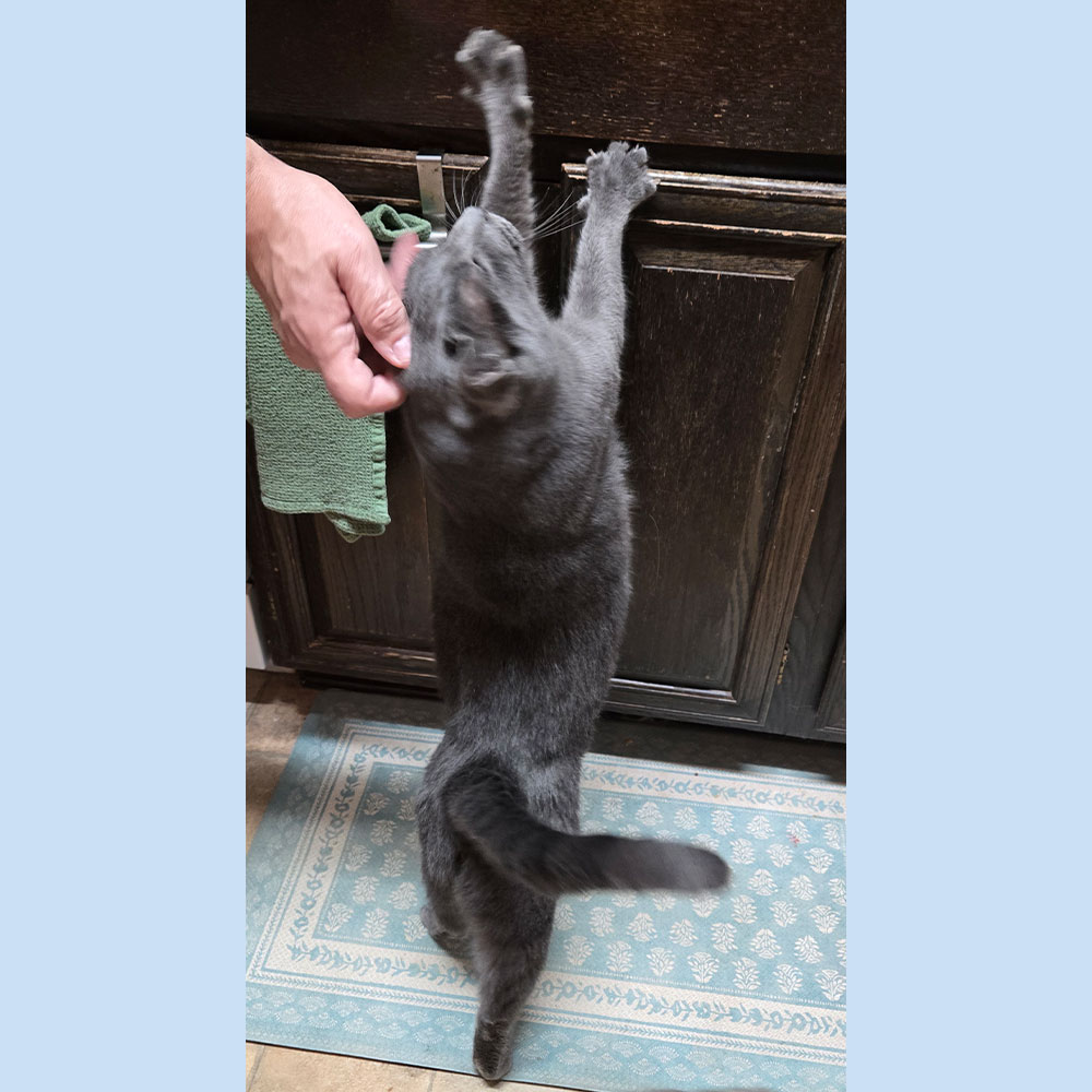 Teddy is ruler of the roost in his home, whether he is sitting on the back of the couch, or at the top of his favorite cat tree. Mom, Larene, reported that Teddy is doing well, despite having heart and kidney issues earlier this year. Adjustments to his medication have helped and Larene has figured out how to dispense his daily pill without losing a finger! Larene continues to be amazed by his transformation: “Since we brought him home, he has changed from a scared, untrusting cat who hid, to a lovey who runs to greet me for hugs and kisses.”