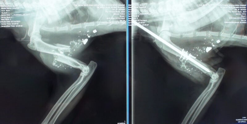 X-rays revealed a shattered humerus – the bone in his upper front leg – along with metal fragments embedded in the tissue, indicating a gunshot wound, most likely from a pellet gun. The bullet tore through his leg and exited near his armpit, dangerously close to critical nerves that control limb movement.