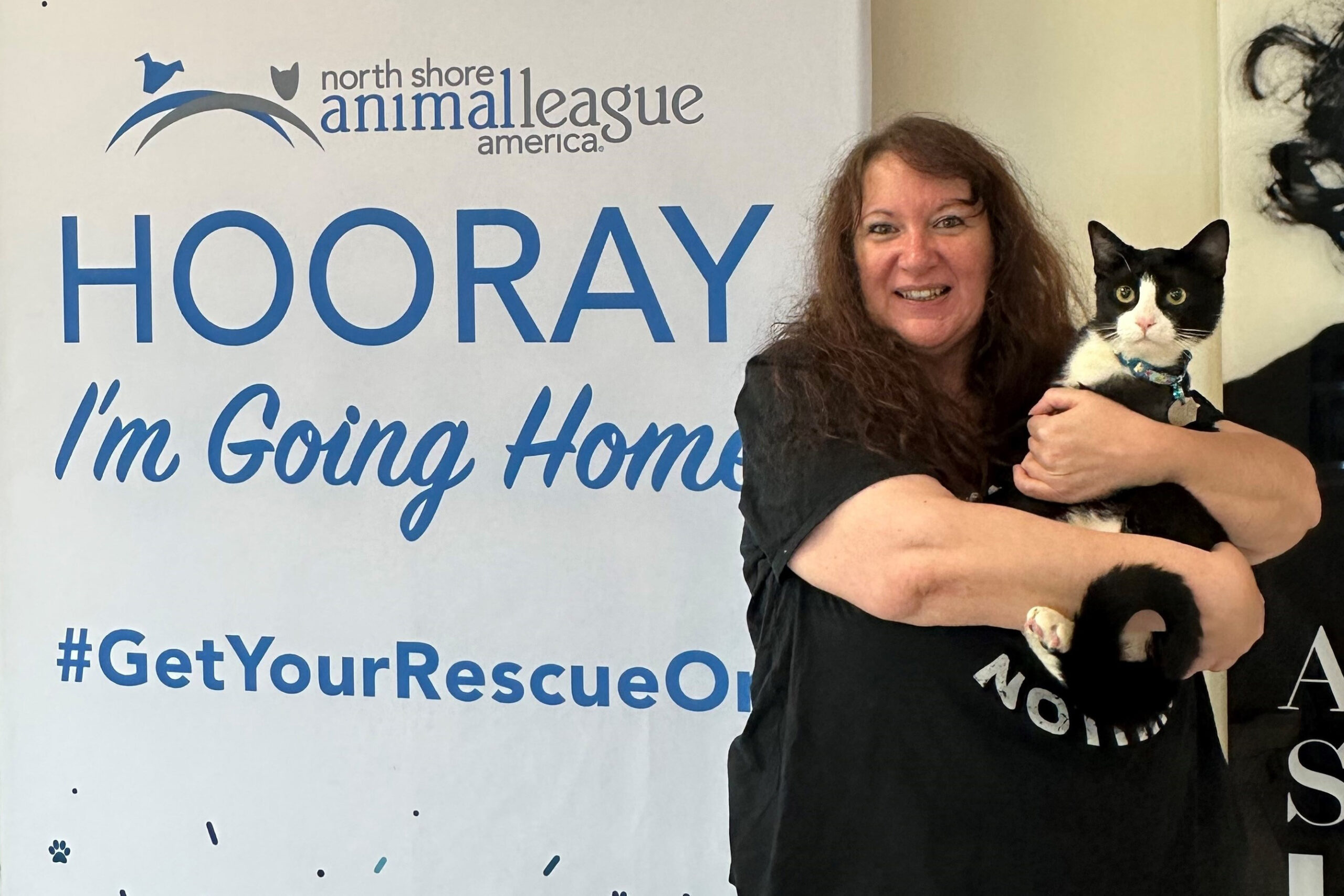 Brewster was adopted by North Shore Animal League America’s own Lorri Stamile, Manager of Gift Planning, who says she fell in love the moment she read his story. Now thriving in his forever home, Brewster is full of energy and affection. “He acclimated quickly,” Lorri shared. “His leg seems okay even after jumping and chasing—he knows when to take it easy. He immediately bonded with my 12-year-old cat Franklin, and they love to play wrestle. He’s obsessed with the laser pointer, watches birds from the window, and is just the sweetest, most lovable boy. It’s a privilege to have rescued him and be his momma.”