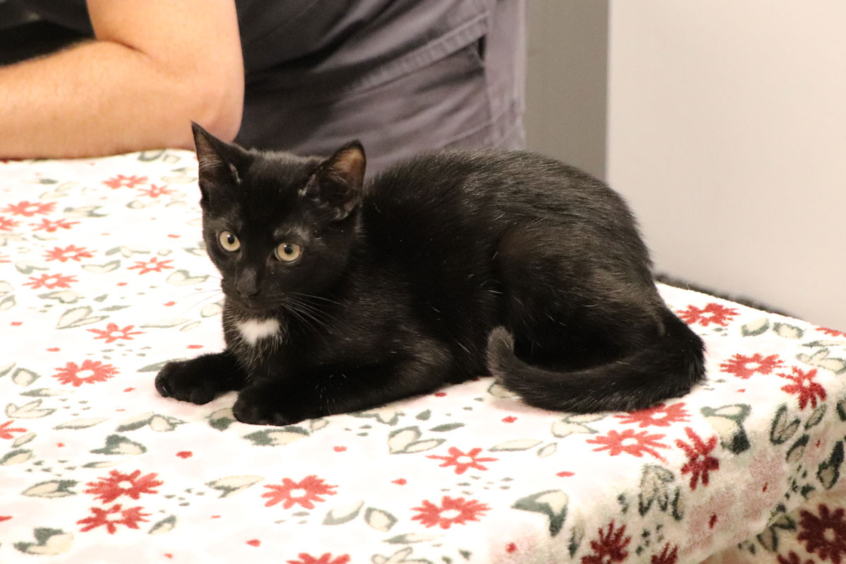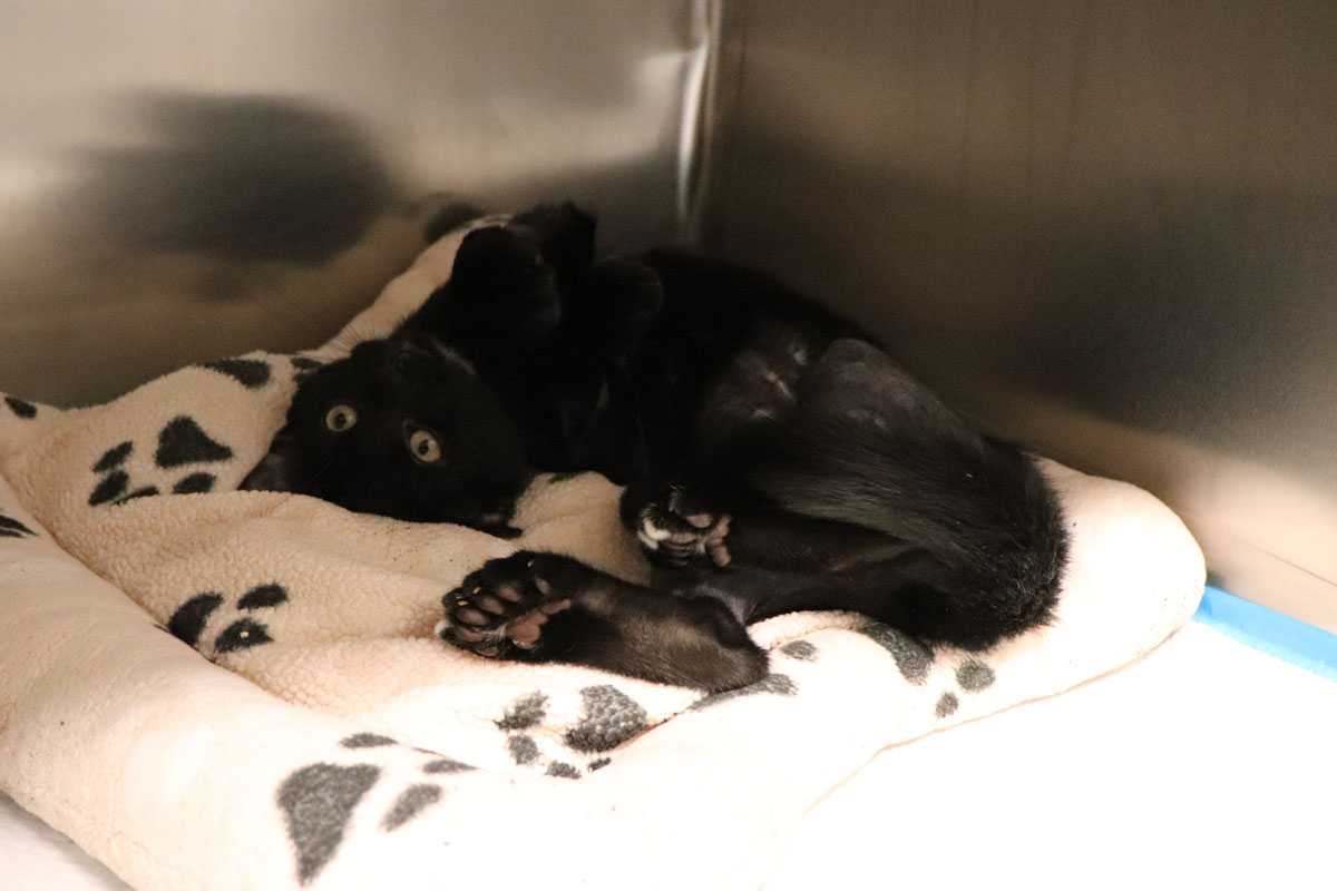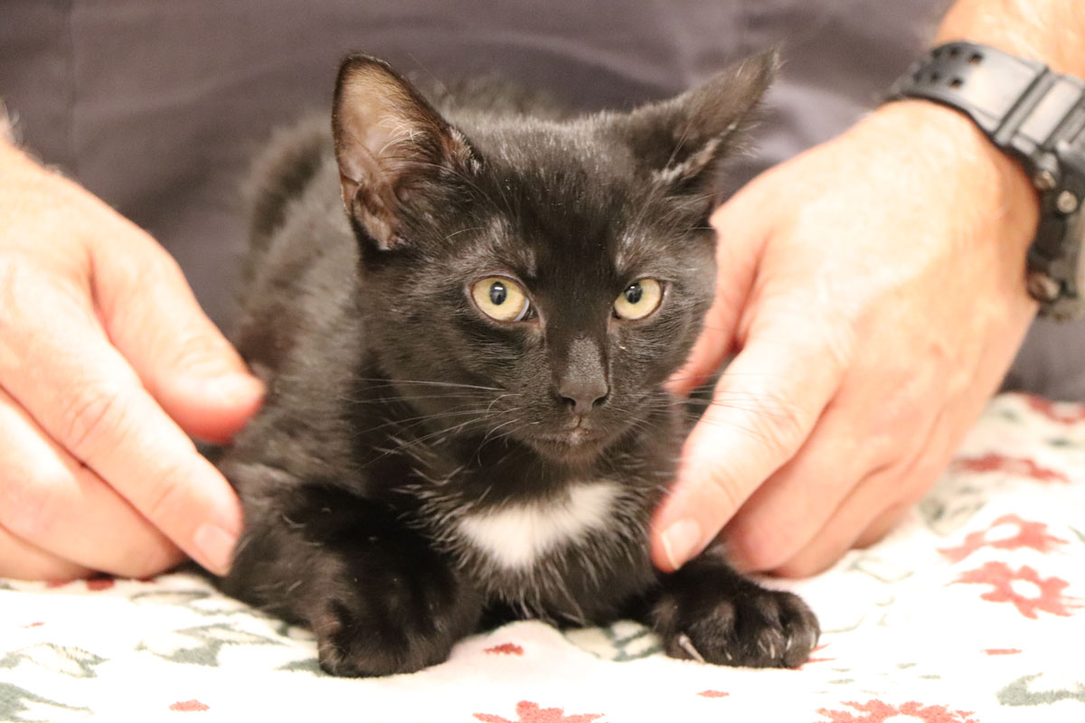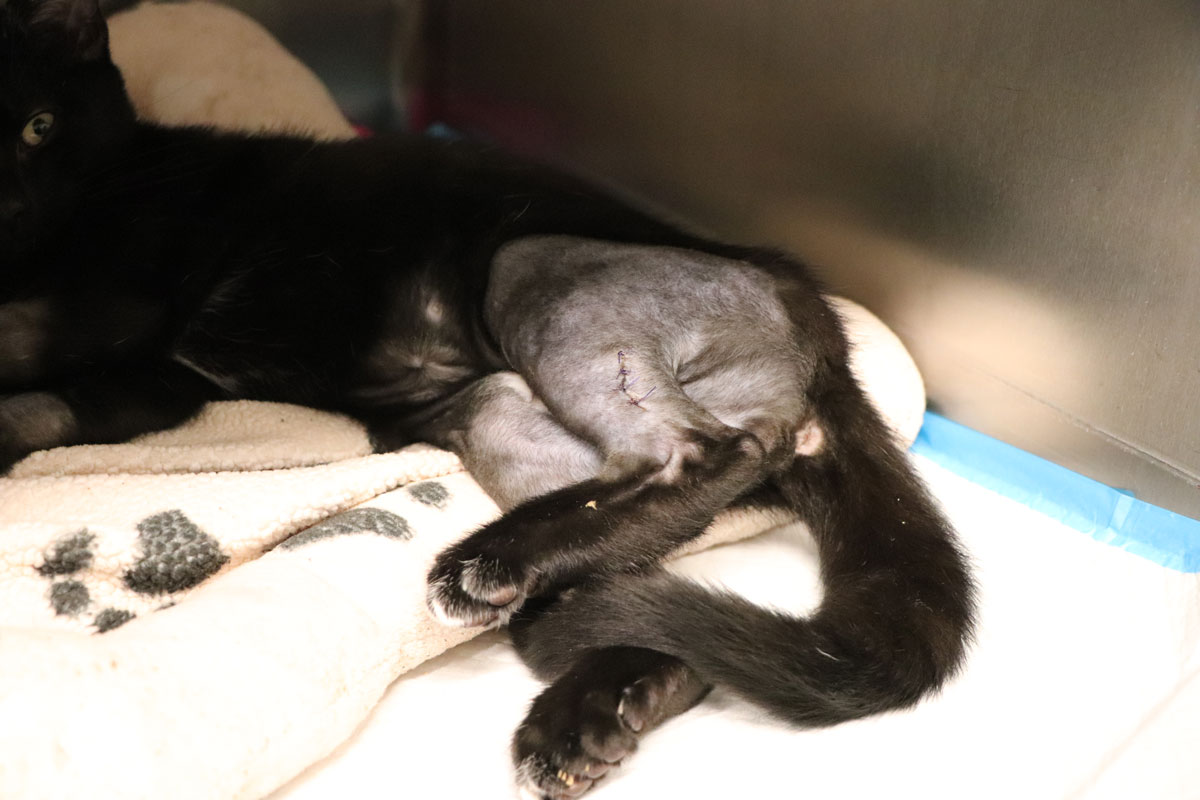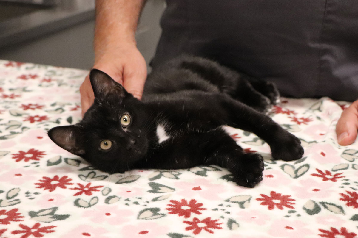 When Mantis arrived at our Adirondack Region Cat Adoption Center, the team immediately noticed something wasn’t right. The small, black kitten moved with an awkward, crouched gait because his back legs didn’t straighten properly.