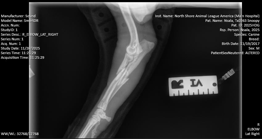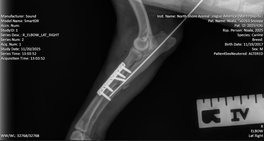 Snoopy, a two-year-old hound mix, arrived wearing a splint. X-rays revealed, however, that the splint was doing more harm than good. “His radius and ulna were completely fractured, and the bones inside the splint had shifted,” said Dr. Verdino. “If left to heal that way, the leg would have ended up several centimeters shorter and completely nonfunctional. Ultimately, it would have been amputated.” Instead, Snoopy underwent surgery to stabilize the limb. “We placed a metal plate and screws on the radius and a small pin on the ulna. Surgery went well, and he’s already weight-bearing. His long-term outlook is excellent.”